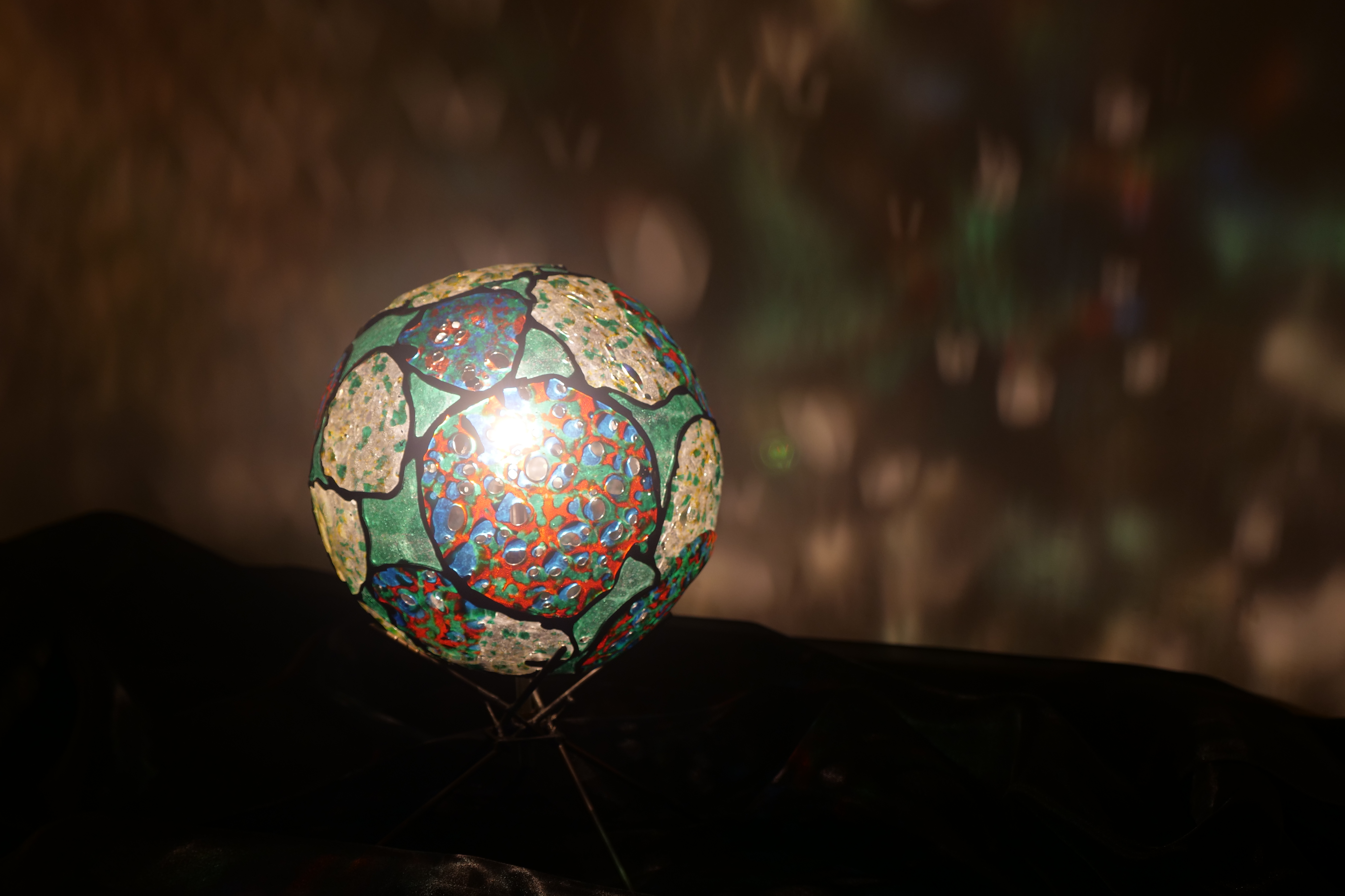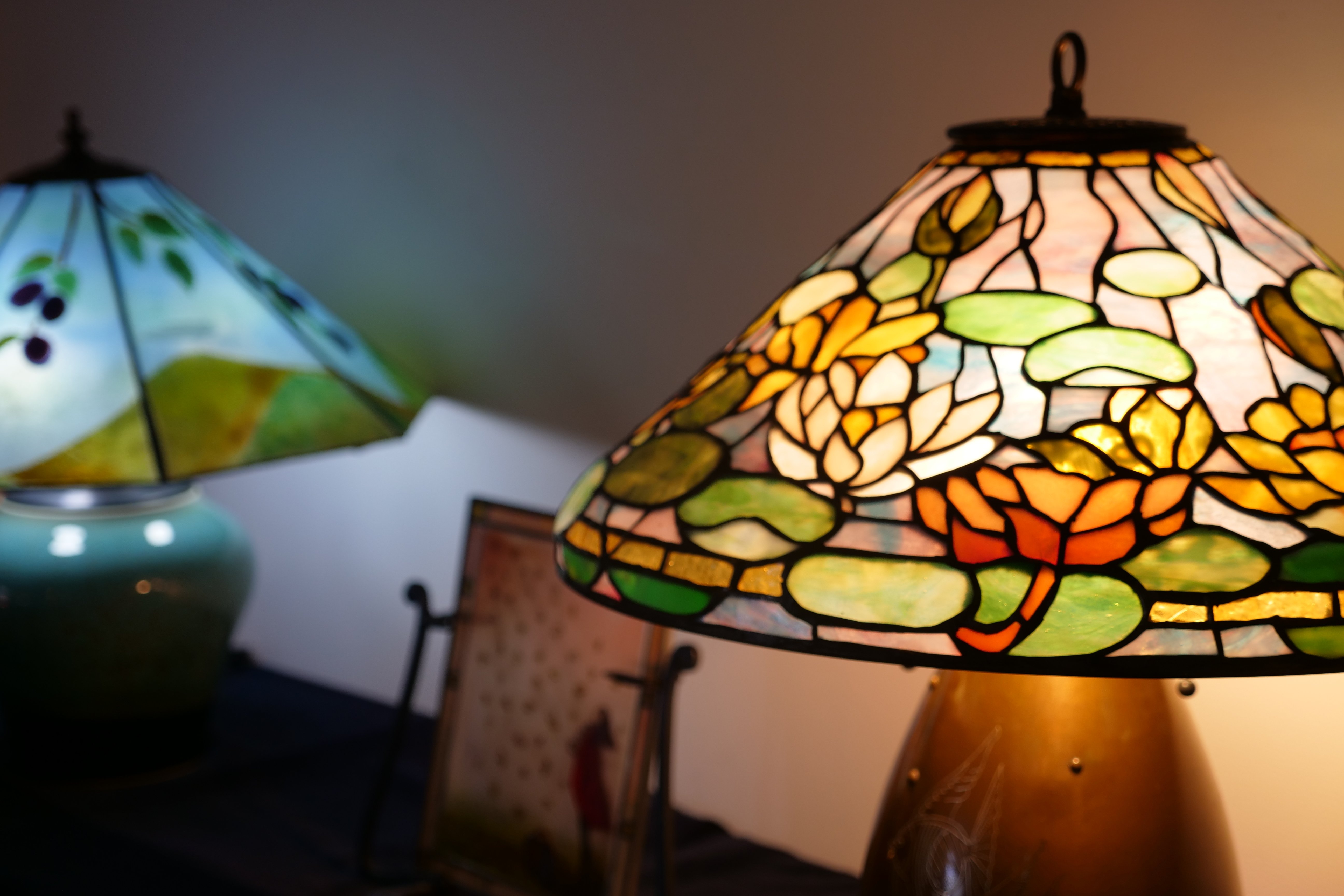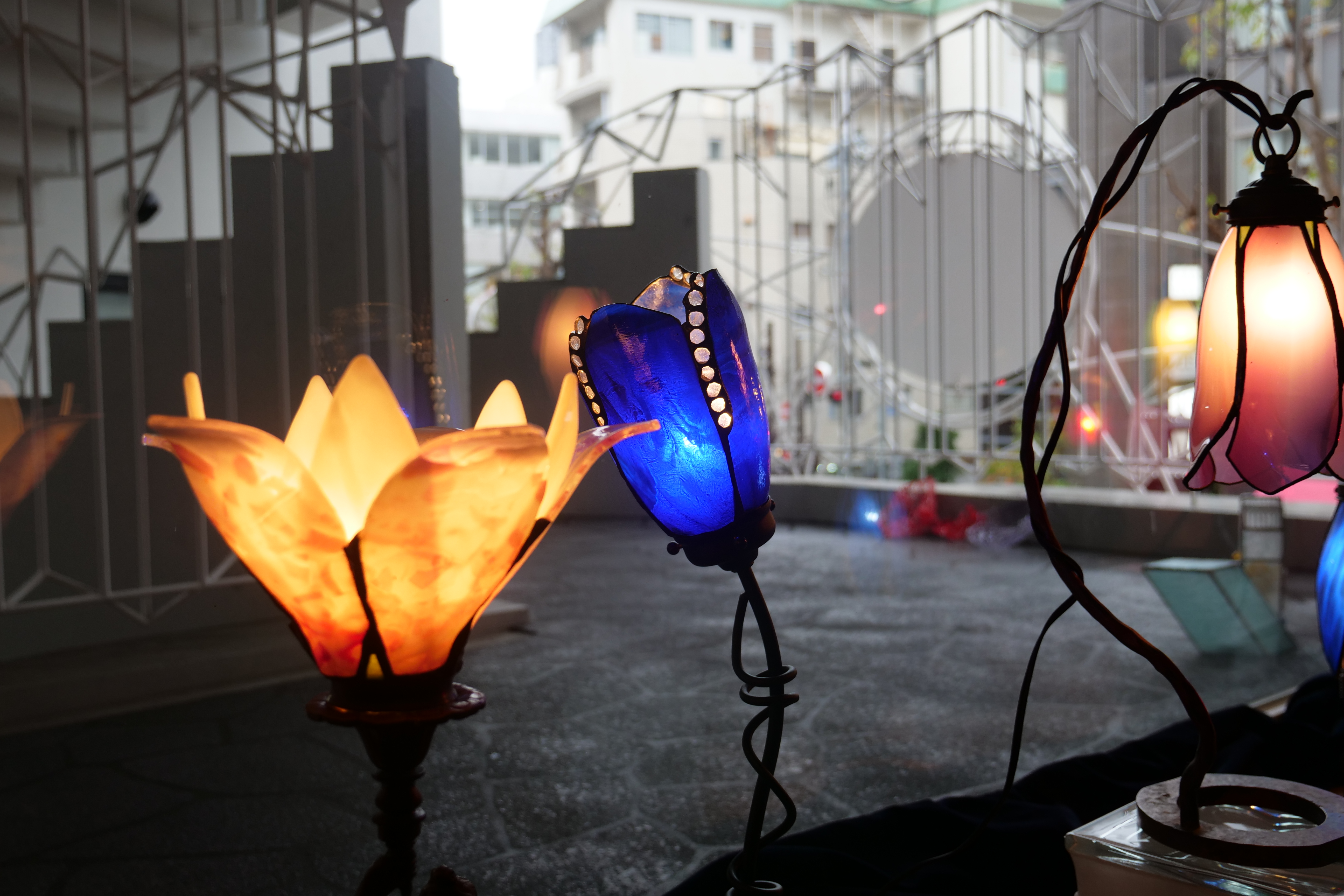 展示室の奥と2階にはステンドグラスを使用した立体作品がたくさん!