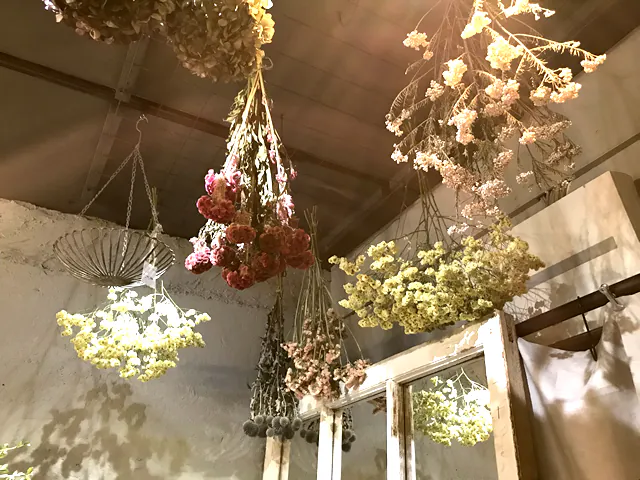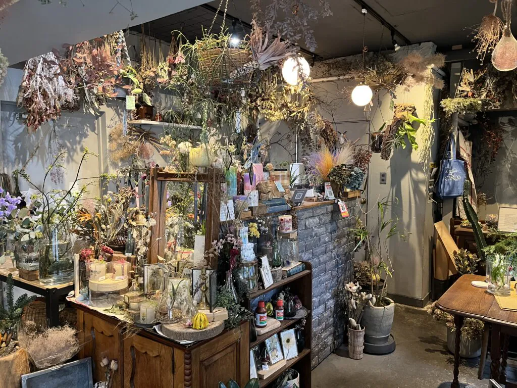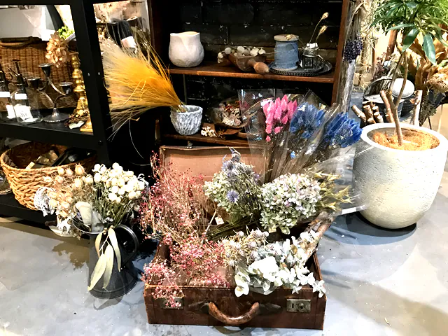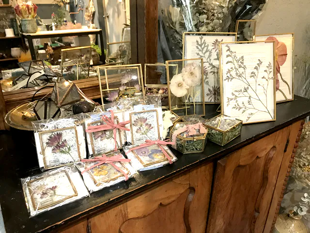 店内には不思議着な模様を付けた観葉植物や、綺麗な色を保ったドライフラワー、押し花フレームや花のスワッグ・リース・ヘッドパーツなどのおしゃれアイテムが床、壁、天井と所狭しと並んでいます。