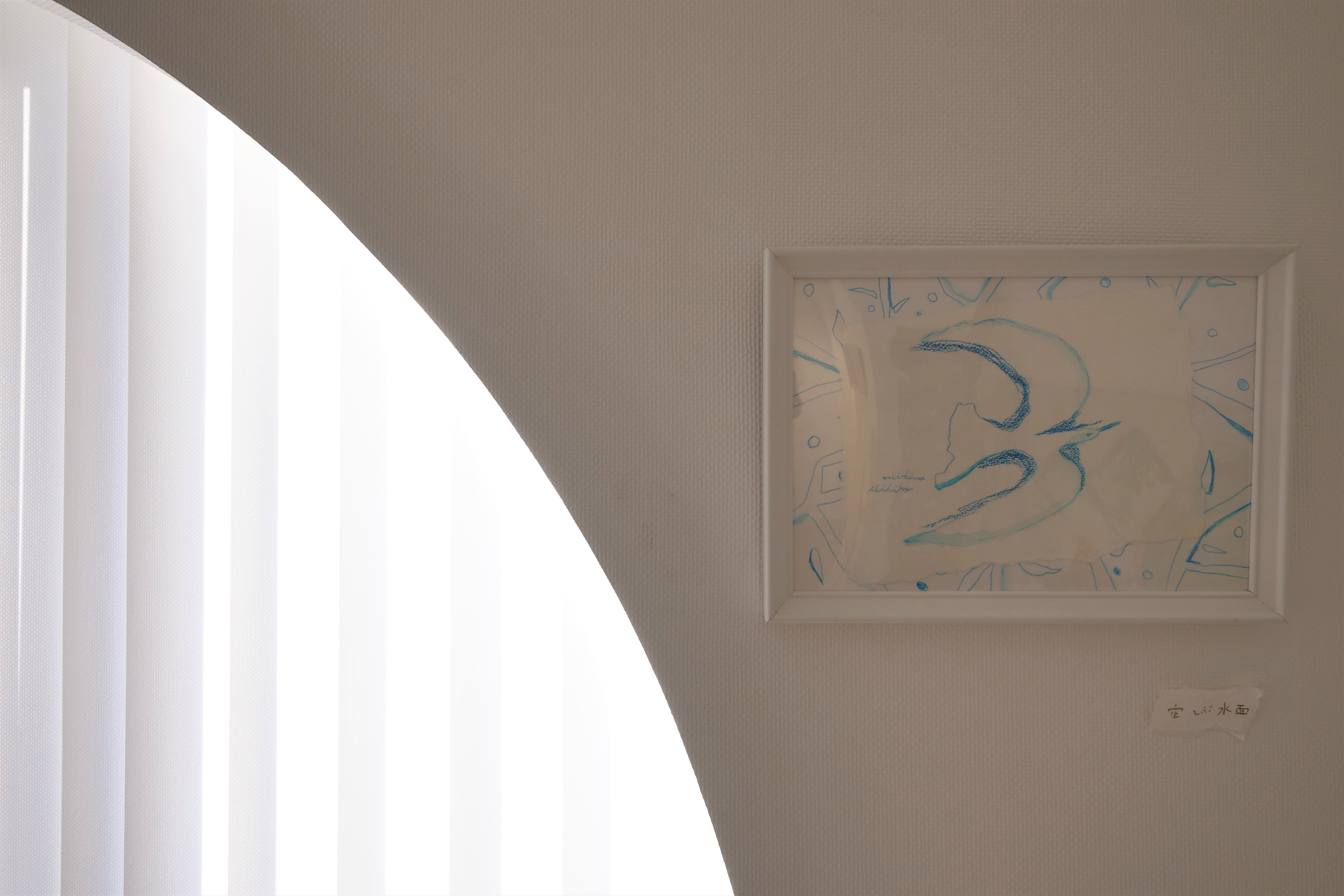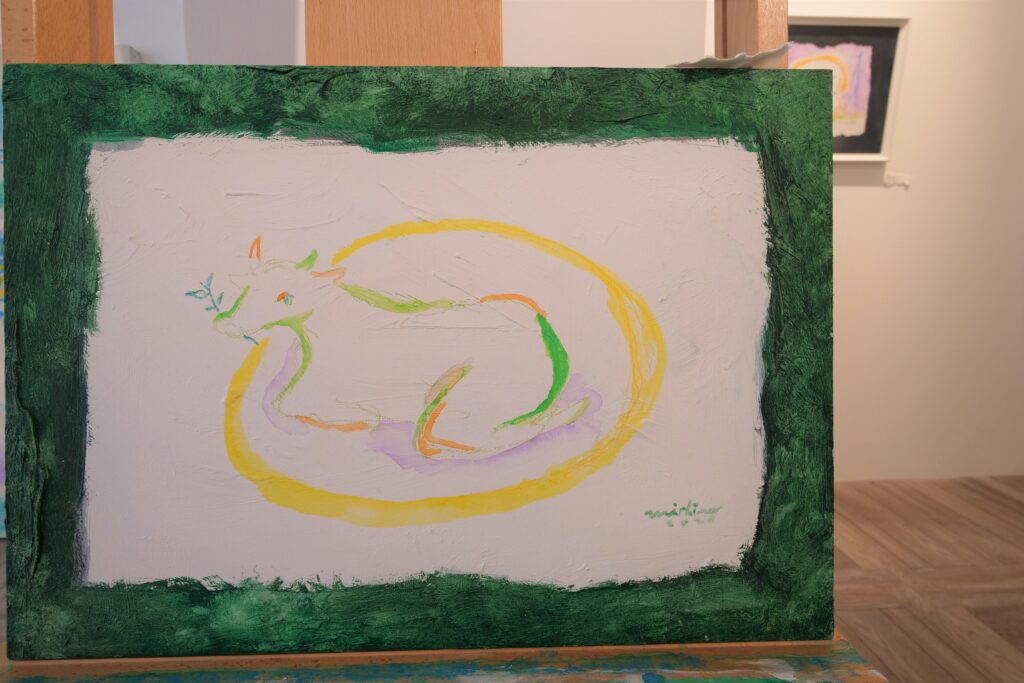 キャンバスは水彩画を彷彿させんばかりの風合いだが、優しいタッチで描かれるアクリル絵の具は希望を感じさせる。