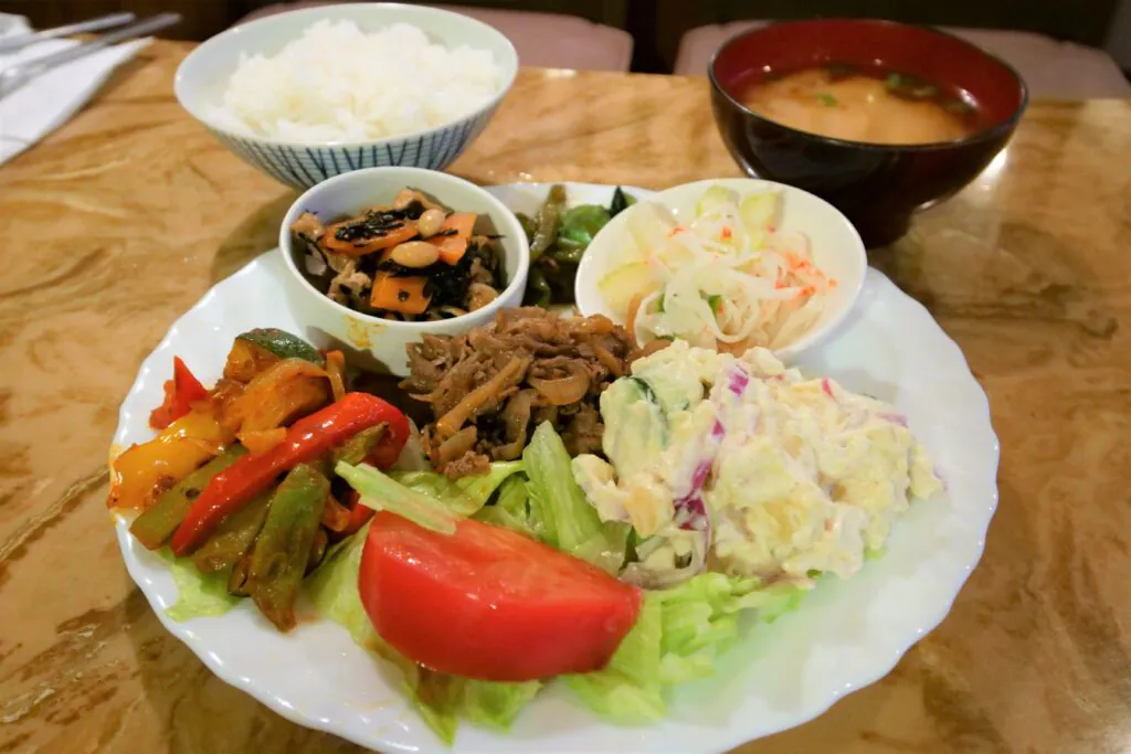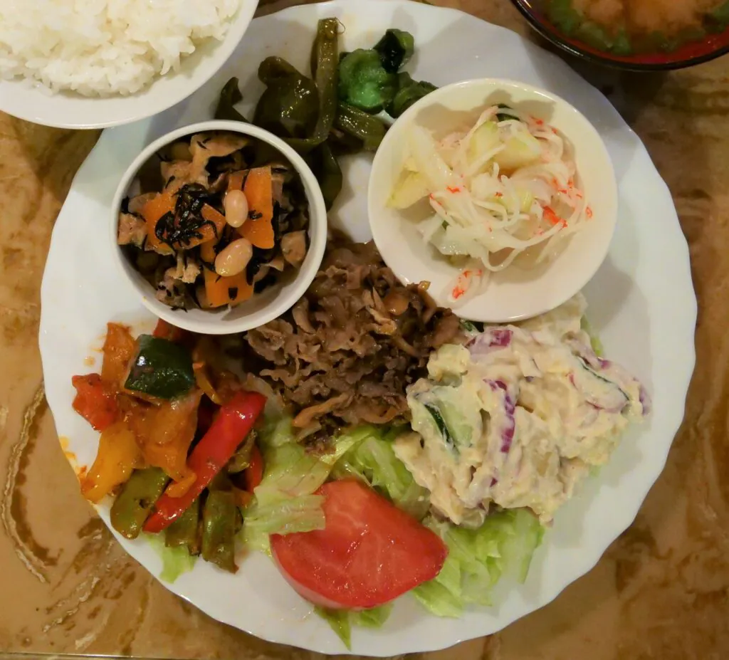 ポテトサラダは芋が大粒ごろごろタイプでおいしいし、牛肉と玉ねぎの生姜炒めはこれだけでご飯ペロリ、夏野菜のカレー炒めはズッキーニやパプリカなどがカレーのスパイシーさと調和して(あ・・・夏だ・・・。)と井之頭五郎ばりに脳内の自分が季節を感じる。