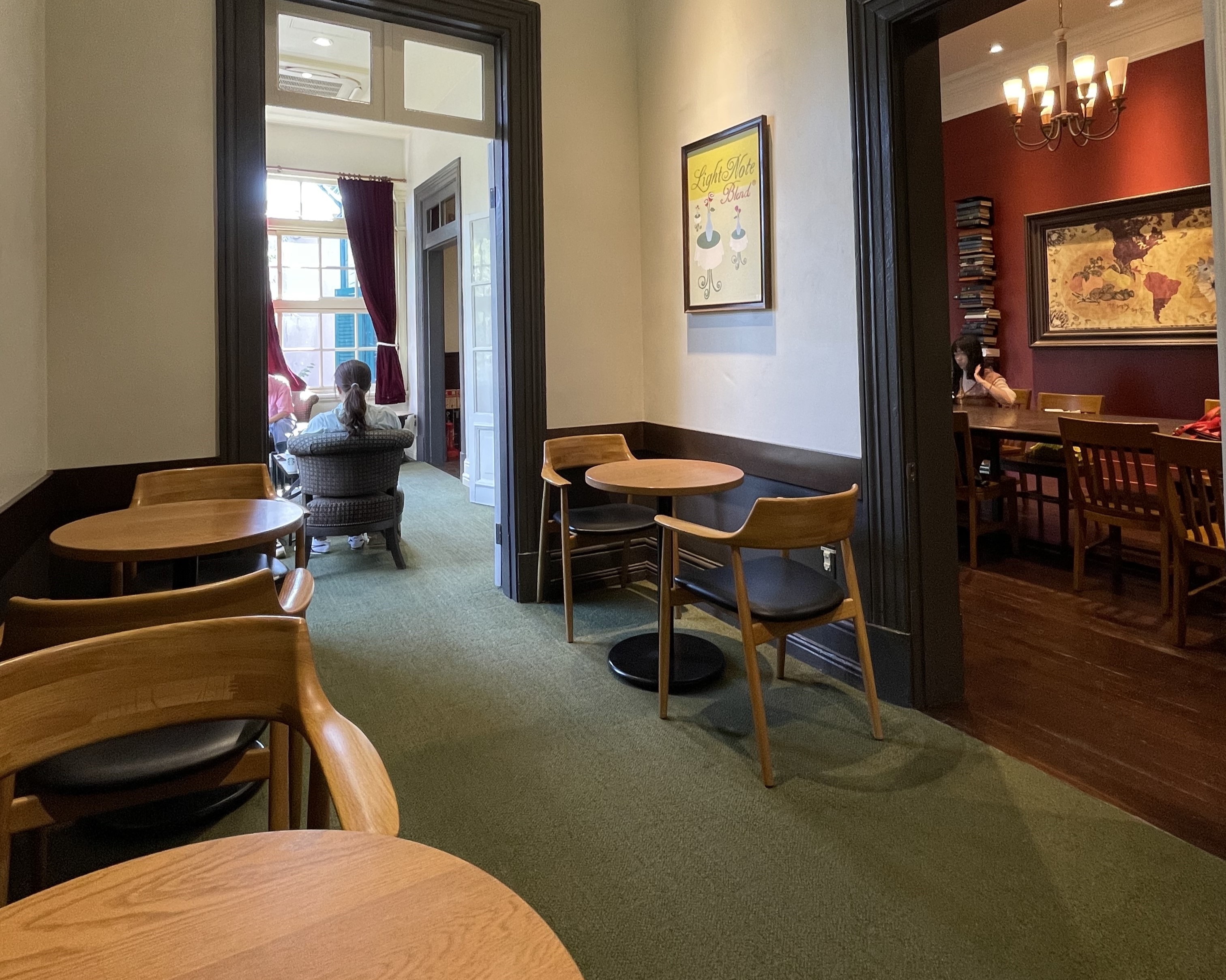 入口に入ってすぐ、赤い階段がお出迎えしてくれる通り、店内は二階建てです。そして、お部屋の一つ一つに“LOUNGE”、“STUDY”、“LIVING ROOM”など看板がかけられていて、住宅として誰かがお住まいになっていたころの名残を感じます。