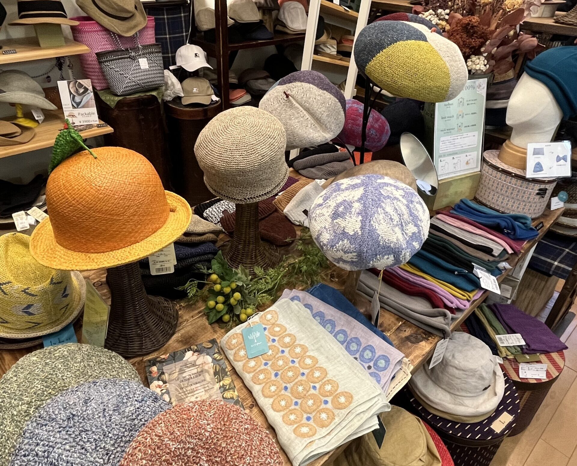 見たことのないかわいらしいデザインの帽子や、ハットの中でも最もポピュラーなタイプの中折れ帽。